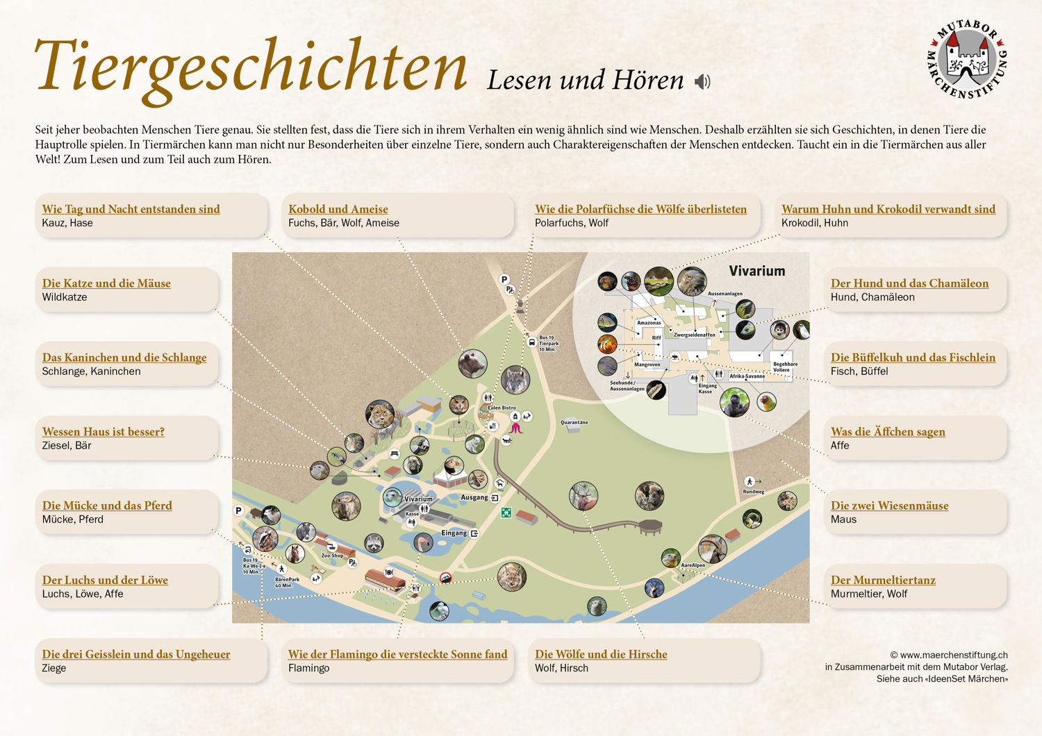 Seit jeher beobachten Menschen Tiere genau. Sie stellten fest, dass die Tiere sich in ihrem Verhalten ein wenig ähnlich sind wie Menschen. Deshalb erzählten sie sich Geschichten, in denen Tiere die Hauptrolle spielen. In Tiermärchen kann man nicht nur Besonderheiten über einzelne Tiere, sondern auch Charaktereigenschaften der Menschen entdecken. Taucht ein in die Tiermärchen aus aller Welt! Zum Lesen und zum Teil auch zum Hören.